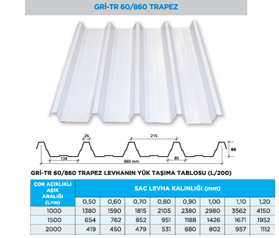 Çatı döşemesi minimum 0.70mm kalınlığında 275gr/m2 galvaniz kaplı çelik profilden RAL boyalı,60/860 formda trapezoidal şekilli ve ihtiyaca uygun olmalıdır. 1300mm aşık aralığında L/200 eğim şartnına göre min. 852kg/m2 yük taşıma kapasitesine sahip olmalıdır.